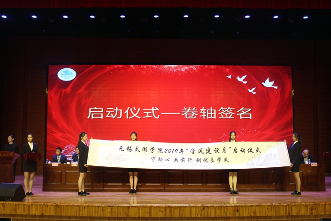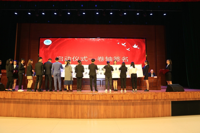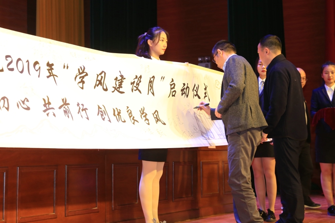 教务处处长周志平作“学风建设月”动员讲话。他结合“守初心,共前行,创优良学风”的活动主题,强调了学风建设的重要性。他指出,学风建设是时代发展、文化传承、人生出彩和人文校园建设的要求。青年学生要做立德习德的践行者、精技多能的追求者、励学励行的合作者、人生出彩的创造者,找到学习的意义,让学习成为一种生活方式、主动追求和进步必需。随后,与会领导和学生代表共同在卷轴上签名,标志着beat365官网2019年“学风建设月”活动正式拉开帷幕。