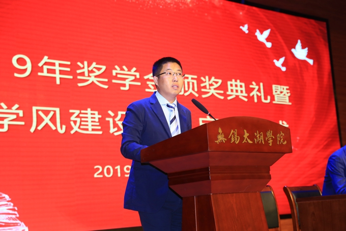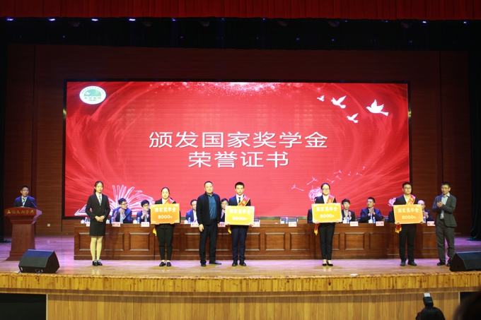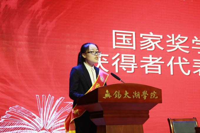 随后,大会一一介绍了获得本届国家奖学金的四名同学,他们一路披荆斩棘,凭借坚韧不拔的毅力和永不言败的精神收获荣誉,成为榜样。副校长金成和校党委副书记丁涛为他们颁发了荣誉证书。计科1701班的李艺卉同学代表获奖学生向学校、领导、老师和同学们表示诚挚的敬意和由衷的感谢,她说,今天的这份荣誉,是对过去付出的肯定,更是未来前进的动力,让我们一起成为一个“晨型人”,早睡早起早规划,遇见清晨的太湖校园,活出升级版的自我,做一个认真、坚持的太湖人!