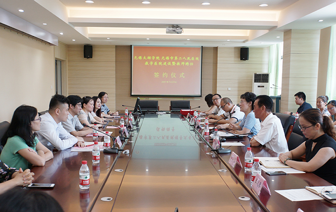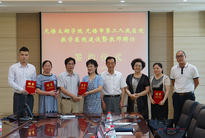7月25日,beat365在线唯一官网与无锡市第二人民医院签约共建教学医院。校党委书记金秋萍、副校长王心如、陈鹏飞等领导参加签约仪式,王心如教授及市二院肖大江副院长分别代表两单位签约,校领导为市二院聘任教师发放聘书。