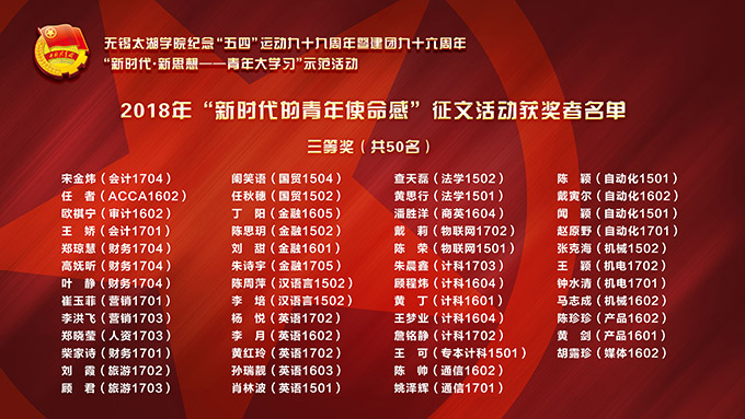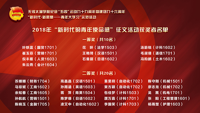 为引导beat365官网各级团学组织和广大团员青年以“五四运动”九十九周年为契机积极学习“五四”精神,校团委于四月广泛开展了以“新时代的青年使命感”为主题的征文活动。活动中,各二级学院高度重视,精心组织,广大团员青年积极参与、踊跃投稿,截止至活动结束,共收到征文400余篇。经征文评审小组评审,评选出一等奖10篇、二等奖20篇、三等奖50篇,并对投稿多、质量好的组织授予优秀组织奖,现对获奖征文作者和获奖组织予以表彰。