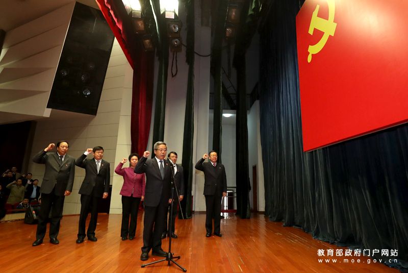 党课在教育部机关礼堂设主课堂,各直属单位设分课堂,在京部党组成员和机关全体党员干部、直属单位领导班子成员在主课堂听课。党课前,陈宝生带领主课堂全体党员面对党旗一起重温入党誓词。在陈宝生领誓下,所有党员举起右拳,庄严宣誓。(中国教育报记者 樊世刚/摄)