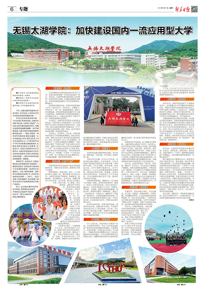 敢于憧憬未来才能拥有未来,始终坚定目标才能实现目标。致力建设一流应用型大学的太湖学院,全力呼应无锡发展战略,倾力服务经济社会发展大局。一举拿下5个国家级一流本科专业建设点,这是学校开启新征程的新起点,今年太湖学院又向全球发出邀约,征聘百名博士、教授,一批学界、业界高端人才纷纷加盟,学校的科研和教学水平再次实现新跨越;学校与西苏格兰大学新一轮合作升级,太湖学院设驻英办事处,与众多英国名校进入多方位多层次合作;6月中旬,太湖学院与国有大型金融机构签订战略合作协议,全面改造升级学校软硬件设施,打造高校资源与金融资本连接聚合的“创业者港湾”;学校与知名上市公司、大企业的产学研合作提质增效。