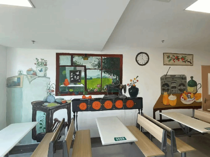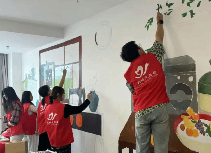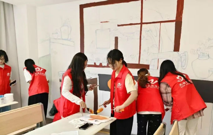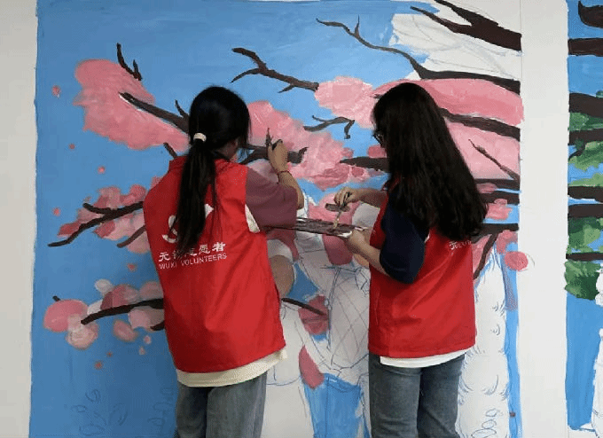 本次无锡精神卫生中心墙绘志愿服务依托学院艺术专业优势,以墙面为立体画布承载创意构想。志愿者将怀旧场景与四季更迭融绘于墙面,为无锡精神卫生中心注艺术氛围。日后,艺院也将继续以文化元素构建情感共鸣纽带,推动青年学子在社会服务中践行志愿精神,实现专业实践与文明建设的有机融合。