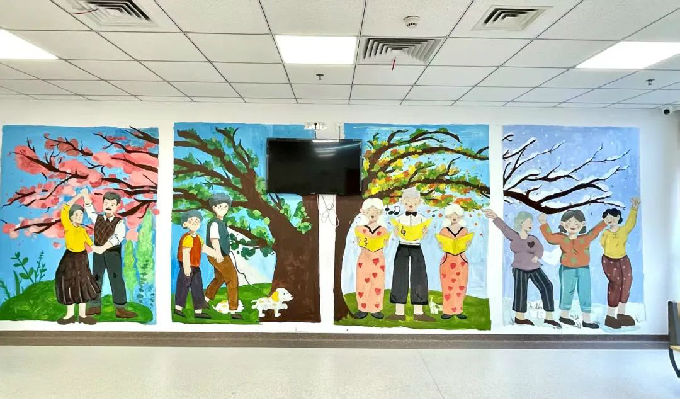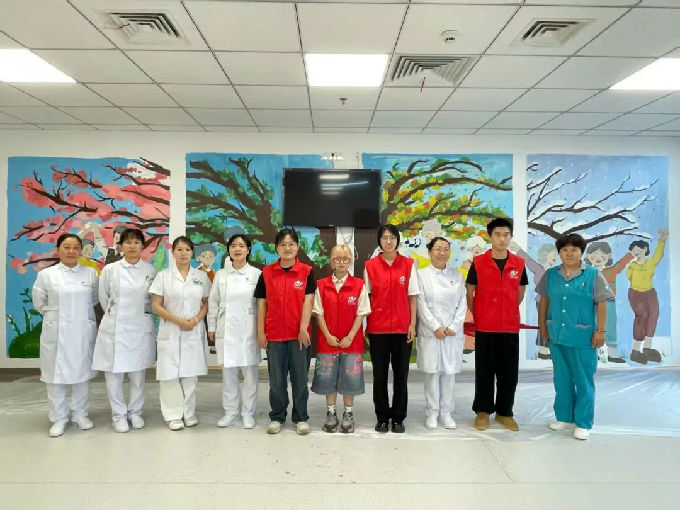 YI行志愿者们迅速投入到第二面墙绘创作,有序分工协作。有人手持调色板专注调配颜料,有人登高绘制随四季更迭变换形态的大树,春添繁花、夏绘茂叶、秋染黄叶、冬描枯枝;有人刻画树下老人与孩童,定格春日起舞、夏日朗诵的生动场景。路过的患者和家属看到鲜活的画面,心情也愈发愉悦。
