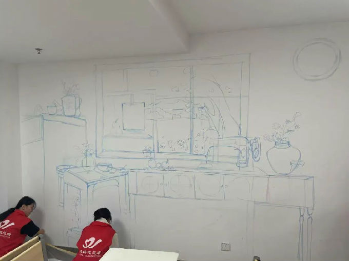 随着创作推进,首面怀旧主题墙绘完成。志愿者们站着,蹲着,俯着在墙面上用画笔为老式冰箱、木桌、缝纫机刻画细节。在志愿者们的默契配合下,充满烟火气的旧日生活场景得以重现。精神卫生中心工作人员参观后盛赞其为兼具艺术与人文温度、非常值得推广的暖心之作。