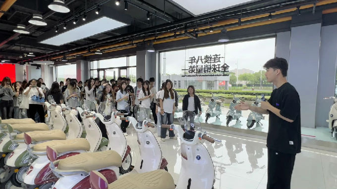 活动伊始,我们首先参观了雅迪的产品展厅。展厅内陈列了雅迪推出的多款明星车型,从高端智能电动车到轻便时尚的都市通勤车,全面展示了雅迪在产品设计、技术革新和用户体验方面的卓越追求。通过讲解员的详细介绍,学生们对雅迪的品牌理念“更高端的电动车”有了更加直观的认识。