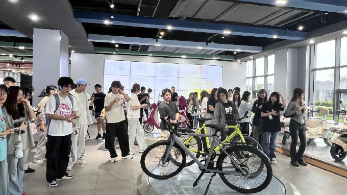 随后,我们在试骑区进行了产品体验环节。我们亲身试骑了雅迪最新发布的电动车型,感受了车辆的操控性能、智能功能以及舒适度。许多学生表示,通过试骑,他们对电动车的使用场景和用户需求有了更深入的理解。