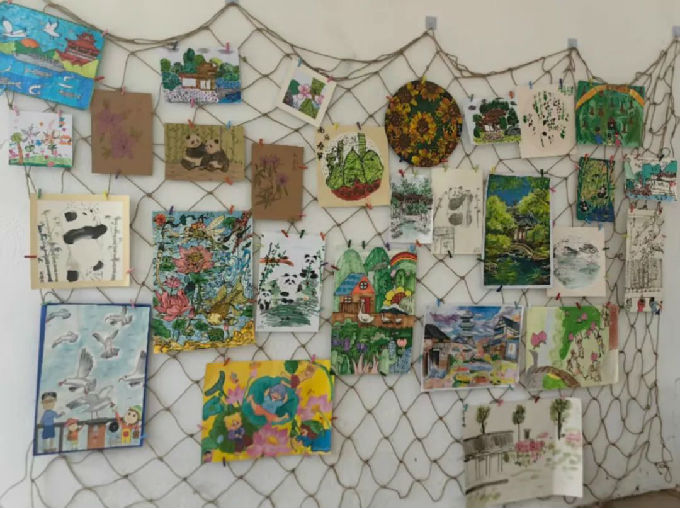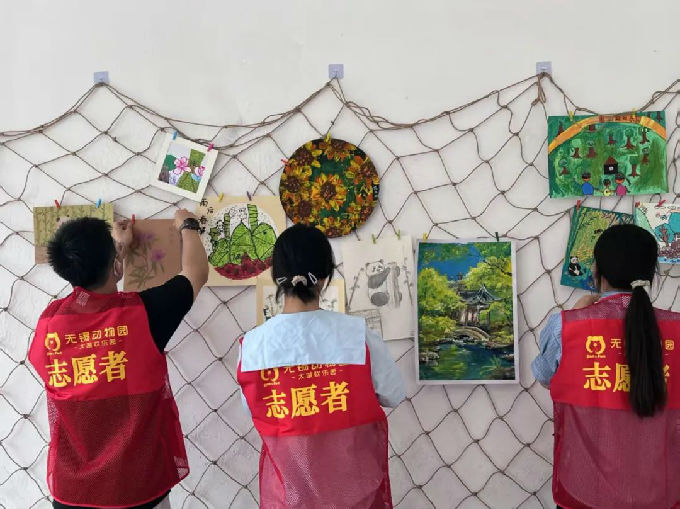 在紫藤长廊展区,这里成了无锡中学生绘画作品的专属天地,以“我把无锡画给你看”为主题进行布置。志愿者们充分利用长廊蜿蜒的空间结构,将孩子们充满童真的画作串联起来。每一幅画都展现着无锡独特的城市风貌与生态之美,有灵山大佛的庄严、鼋头渚的秀美、古运河的宁静,还有太湖边飞翔的红嘴鸥。