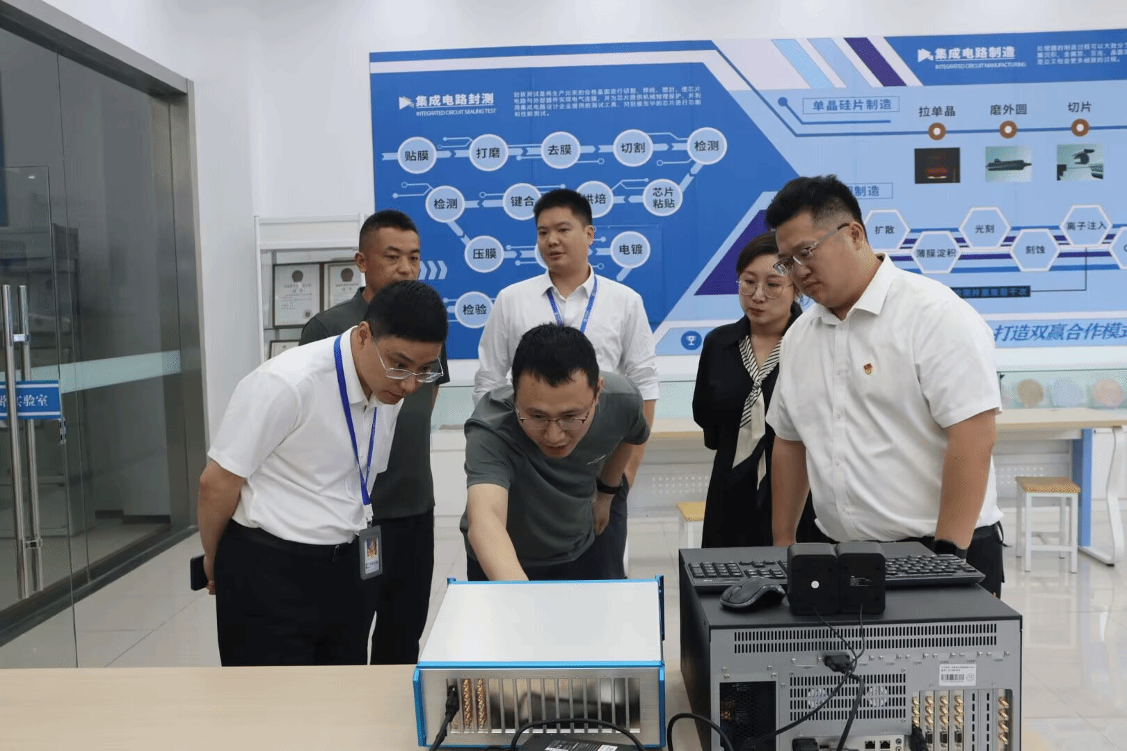 自由交流环节,双方就人才培养模式、技术攻关方向展开深入探讨。中微龙图董事长窦云轩详细阐述企业技术规划与行业应用场景,特别强调了校企协同育人的战略意义。随后,校方邀请企业代表参观集成电路实验室,展示科研成果与创新实践环境。企业代表对实验室配置及学生实操能力给予高度评价,双方进一步探讨了技术发展方向与合作空间。