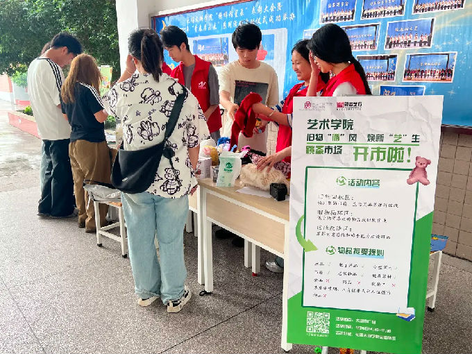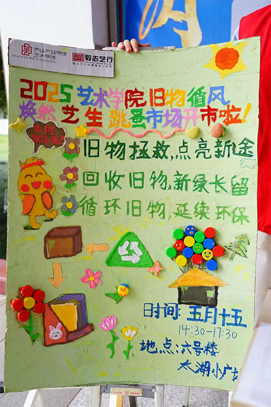 为积极响应国家环保号召,大力践行环保理念,鼓励大家用创意思维和艺术手法赋予旧物全新生命,在校园内营造浓厚的环保氛围。5月15日,艺术学院学生党支部毅志艺行志愿服务工作室于六号楼通道处开展“旧物‘循’风,焕新‘艺’生”跳蚤市场主题活动,此次活动分为旧物回收,旧物改造,旧物循环三个区域,有400余人参加。