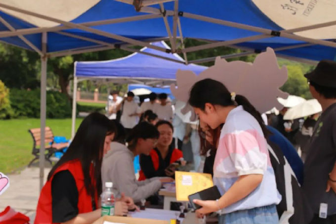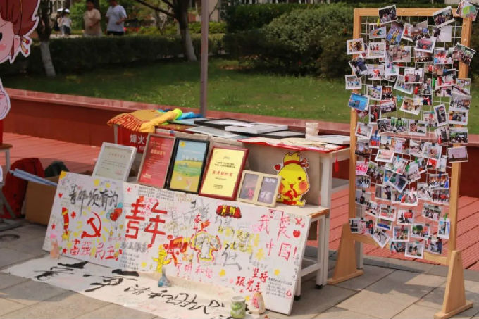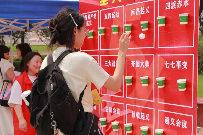 五四摊位同样精彩纷呈,“烽火红途・五四展区” 集中呈现工作室实践成果,通过图文展板回顾十二站党史学习教育历程,串联起党在不同历史时期的奋斗印记;“星火弧光・投掷乒乓球” 区域别出心裁,每个标注着重大历史事件的纸杯成为 “红色知识库”,同学们投掷乒乓球的过程化作与历史的对话,在趣味互动中重温长征胜利、五四运动等关键节点的精神内涵。活动设置的主题打卡区域吸引众多同学踊跃参与,大家在完成各环节任务的同时,更在 “游戏化” 学习中深化了对红色文化的认知。