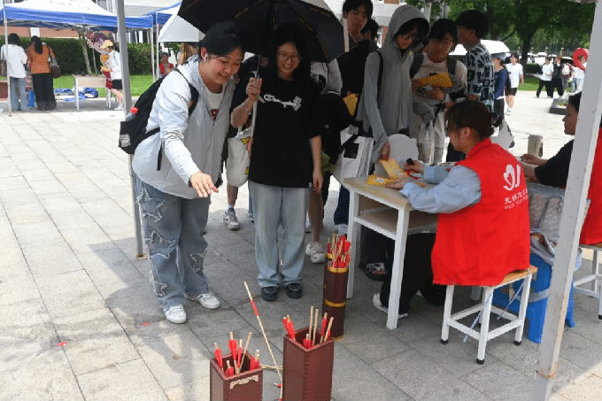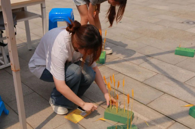 五一摊位上,“劳动最光荣・五一展区” 展出来自毅志艺行志愿服务工作室匠心独运的手工艺品和特色设计;“稻田梦想家・模拟插秧” 区域将农耕动作融入游戏,大家在模拟实践中感受劳作艰辛;“劳动弧线・投壶” 结合传统游戏与劳动主题,锻炼同学们的专注力;“请与我击掌” 区域内,同学们蘸取颜料印下手掌印,斑斓印记交错相连,似青春击掌,尽显团结拼搏的朝气。