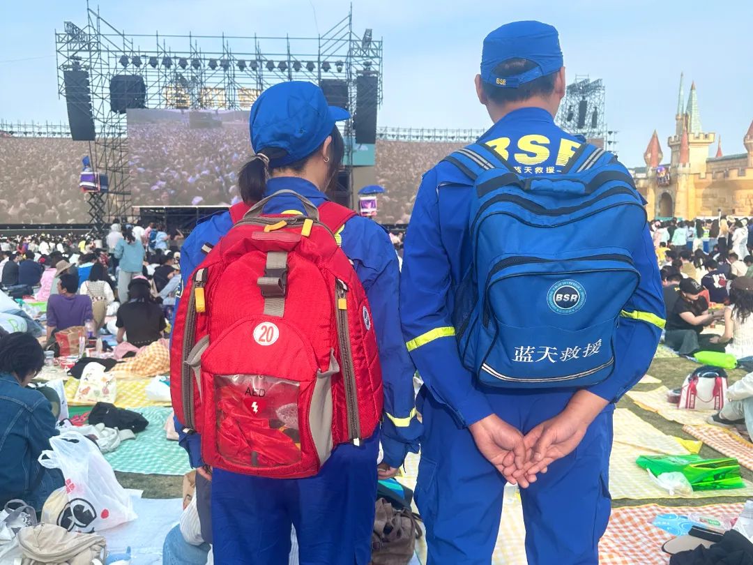 音乐节期间,蓝天救援队设置8个固定站岗点,定期巡逻,时刻保持着高度警惕,仅需2分钟到达救助现场。志愿者们分工明确,各司其职。在普通区,化身 “安全卫士”,来回巡逻,密切关注着现场观众的状态,及时发现并处理可能出现的安全隐患;在VIP的AB区,协助蓝天救援队教官开展救援工作,面对突发状况时,沉着冷静,将前期所学知识迅速运用到实际中,有条不紊地协助完成救援任务。