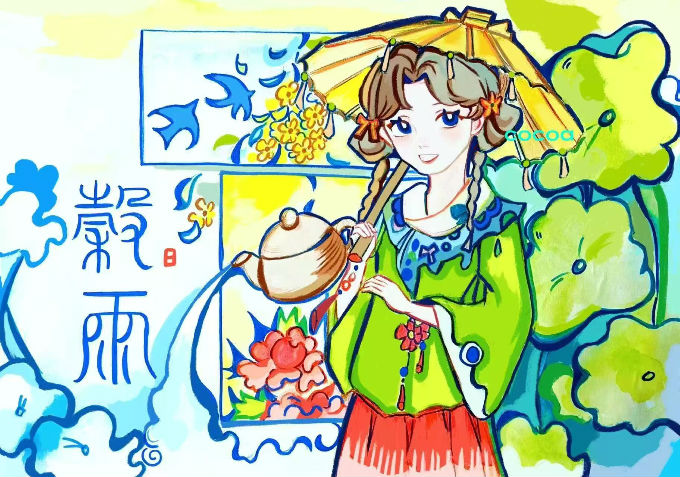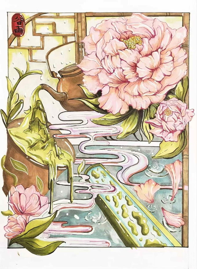 陈小妍同学的绘画作品《毂雨》切合谷雨节气,既保留着江南水乡的古典韵味,又融入了新的时代气息,使得在众多参赛作品中脱颖而出。