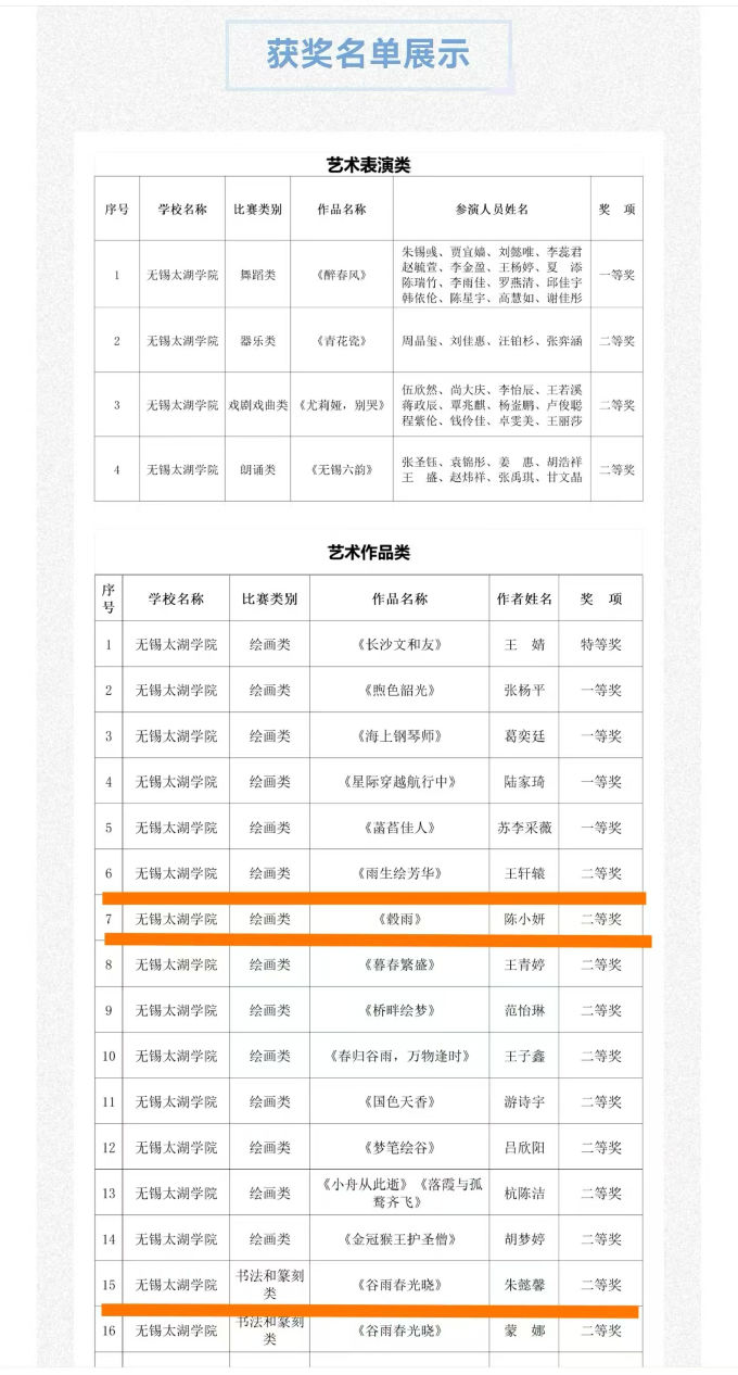 为传承弘扬书画艺术,扩大社团在全市大学生群体中的知名度,推动校园文化交流,艺术学院兰亭书画协会积极参加无锡市大学生校园文化艺术展演,在学生艺术实践工作坊项目和个人奖项方面荣获佳绩。