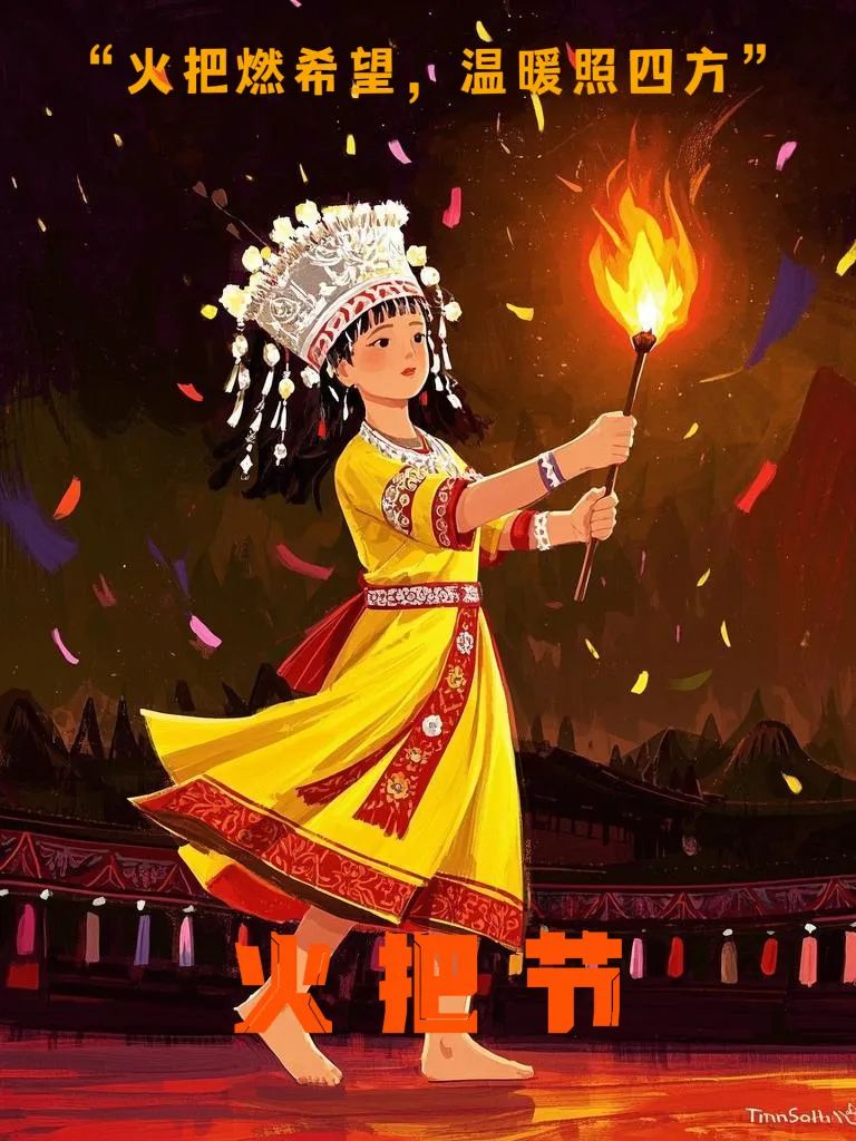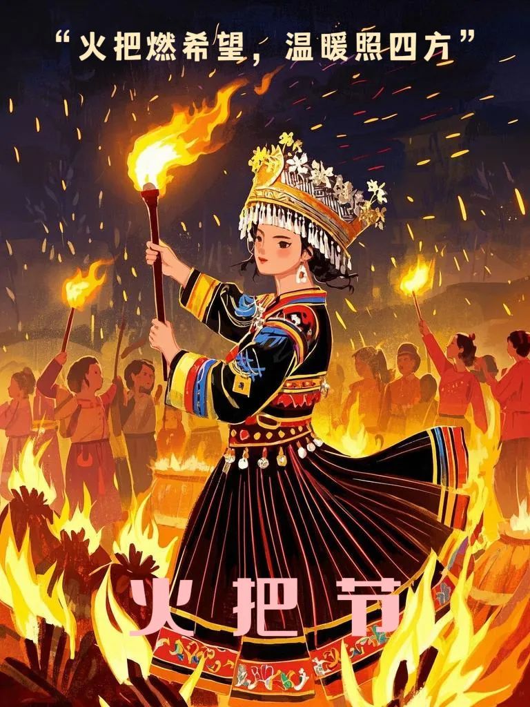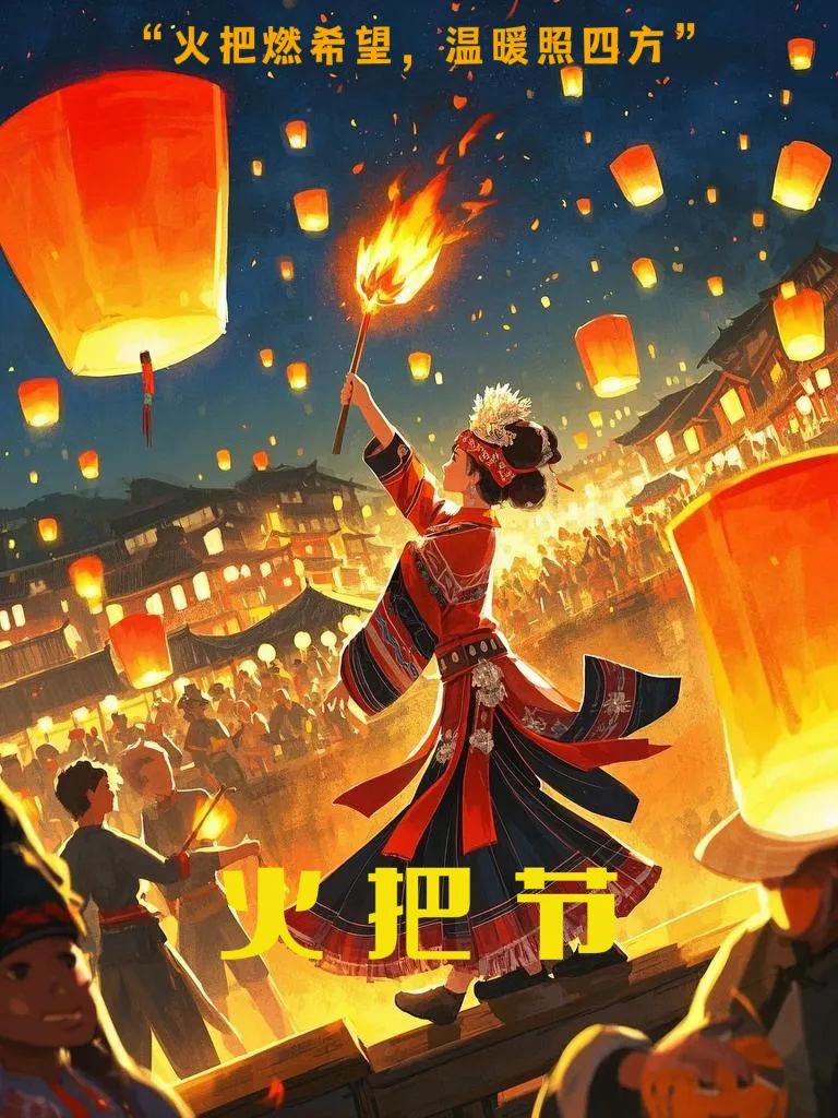 设计说明:《彝族火把节》海报以彝族传统节日为主题,通过丰富的视觉语言展现节日的文化内核。画面多以穿着彝族传统服饰的同胞手持火把,服饰上精美的刺绣纹样与火把的动态光影形成视觉焦点,既突显民族特色,又象征光明与希望。背景中升腾的孔明灯与人群狂欢场景,配合"火把燃希望,温暖照四方"的文案,生动诠释了火把节祈福纳吉的文化内涵。整体采用橙红色系渐变渲染,既呼应火把的炽热意象,又通过简约构图平衡了画面的视觉张力。作为国家级非物质文化遗产的视觉载体,作品通过传统元素与现代设计手法的融合,实现了民族文化的创新表达。