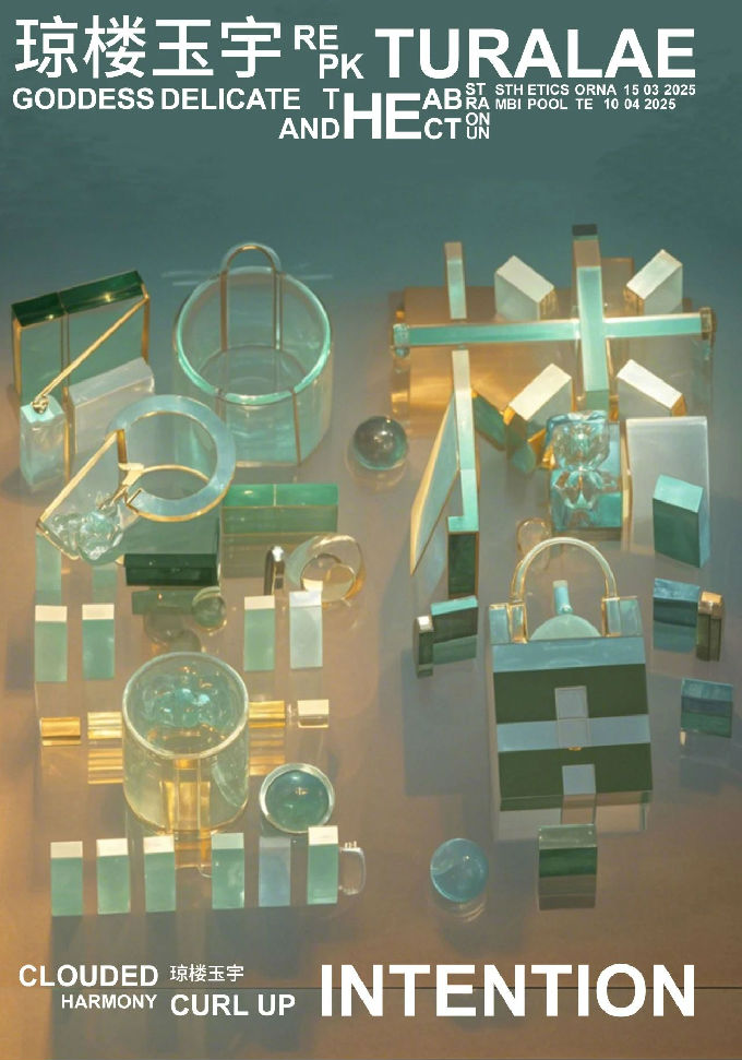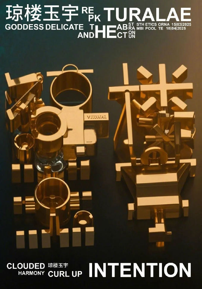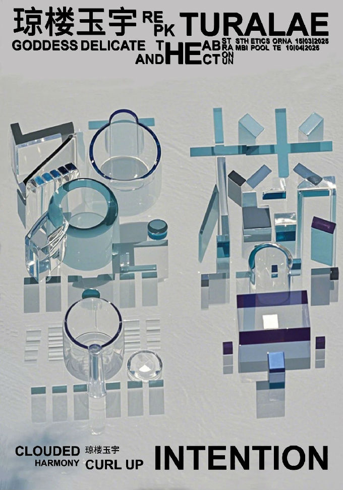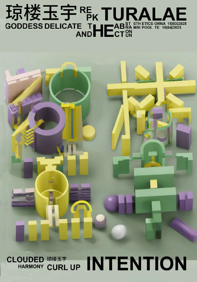 设计说明:3D建模的方式,创造出琼楼玉宇的字样,琼楼玉宇以金属、玻璃、塑料、玉石4种不同的材质展现到眼前,以建筑的形式用错落的大厦,圆柱的联系,构成琼楼玉宇。