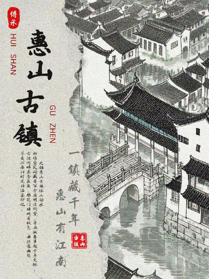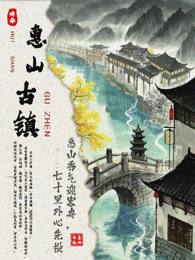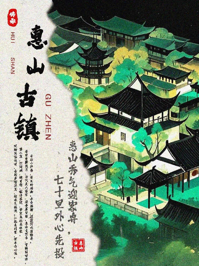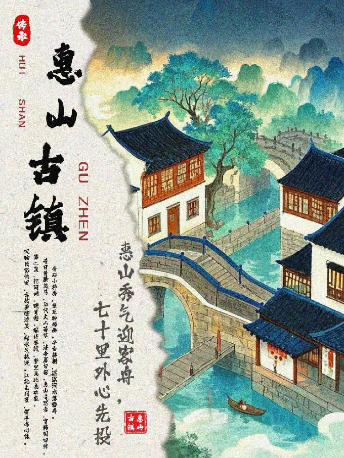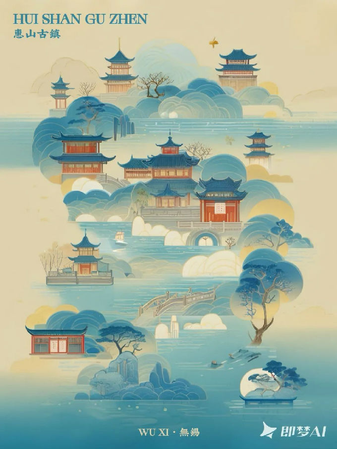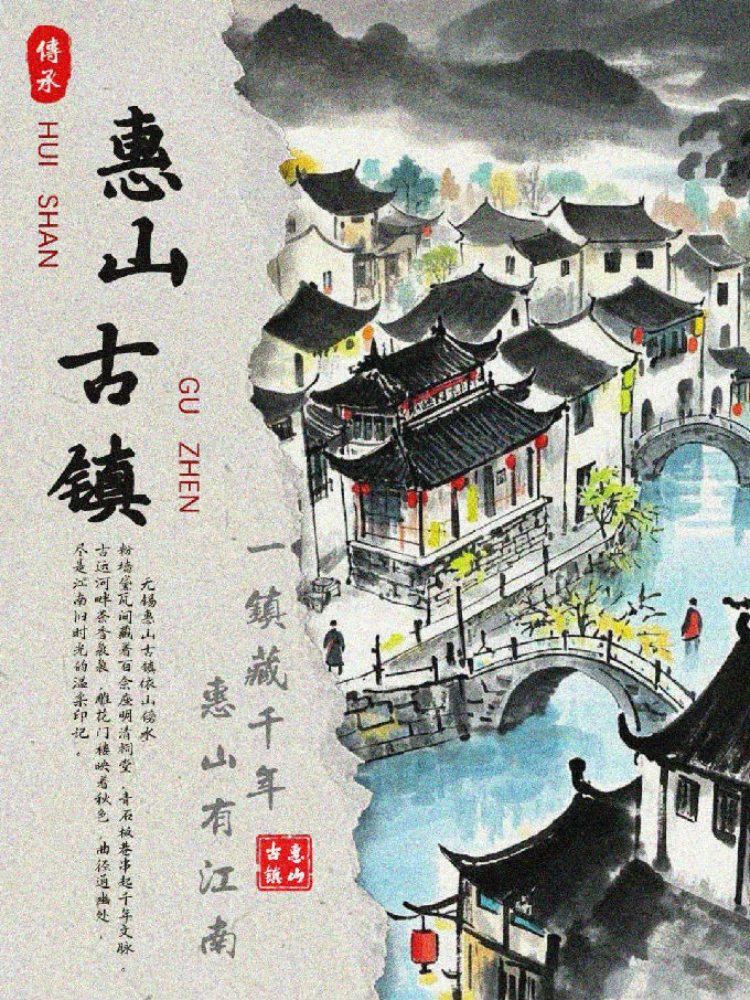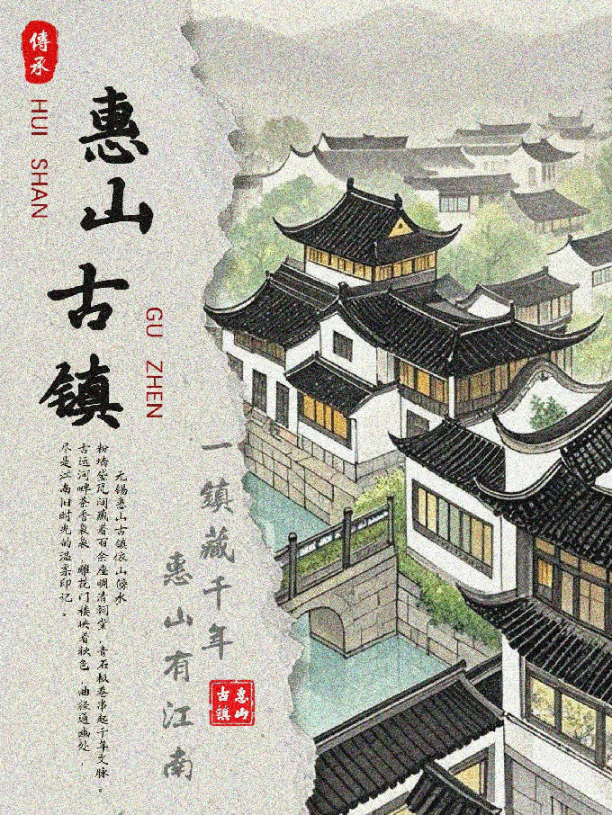 设计说明:这组六张惠山古镇海报,由即梦I将白描、写意、工笔、泼墨、水墨、工笔重彩的技法生成,均以独特视觉风格展现古镇魅力。画面呈现上,或用淡雅水墨勾勒黑瓦白墙、小桥流水,或借清新明快色彩描绘建筑与山水相映成趣之景,再经过后期运用PS软件结合将古镇的江南韵致、灵秀之美生动呈现。