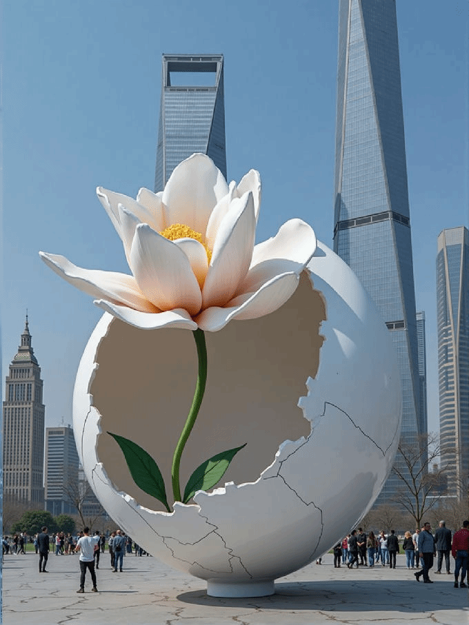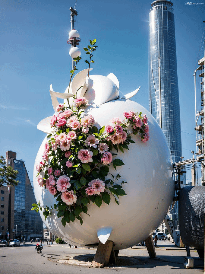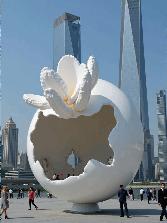 设计说明:利用liblib的AI技术,结合自然元素与城市空间算法,通过参数化设计,装置外观可根据城市数据动态调整,实现技术与自然美学的和谐共生。蛋壳代表生命保护壳,破裂中生长的花朵象征新生命与希望,传递变革与创新的信息,激励人们勇于突破。