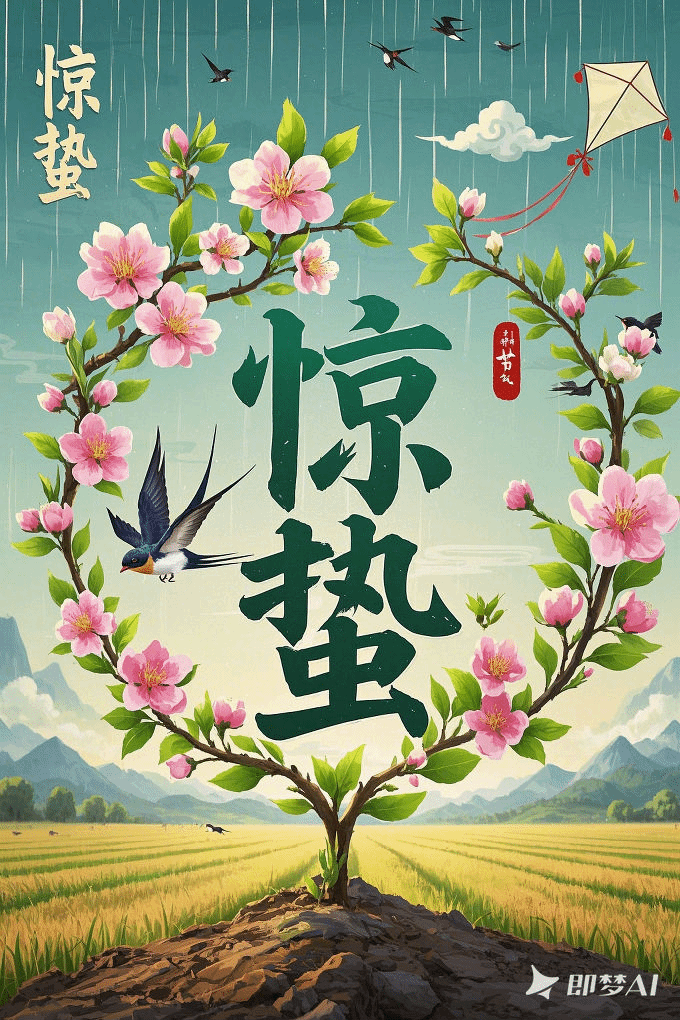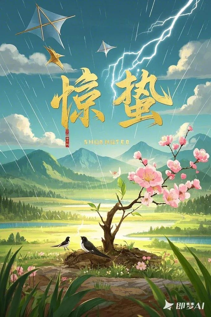 设计说明:本海报由即梦AI精心制作,以“惊蛰”这一节气为核心主题,巧妙地融入了诸多传统美学元素。通过春雷与闪电的动态视觉效果,以及对苏醒植物、燕子和风筝的细腻描绘,有效增强了节日氛围,凸显了传统文化的深厚韵味,并展现了自然界复苏的壮丽生机。