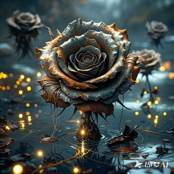 设计说明:画面以“数据流萤火虫”为背景,将“生锈机械”的工业质感、“复古现实”的时光隐喻,与盛放的“花朵”自然生机结合。钢铁玫瑰表现金属永生性与生物短暂性的对抗,钢铁与玫瑰的结合,在通透光影中,实现蒸汽朋克机械美学与自然生命力的碰撞,演绎科技与自然共生的奇幻意境,传递时光流转中生命绽放的浪漫想象。