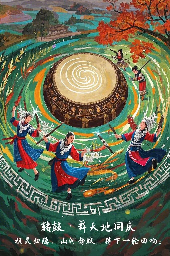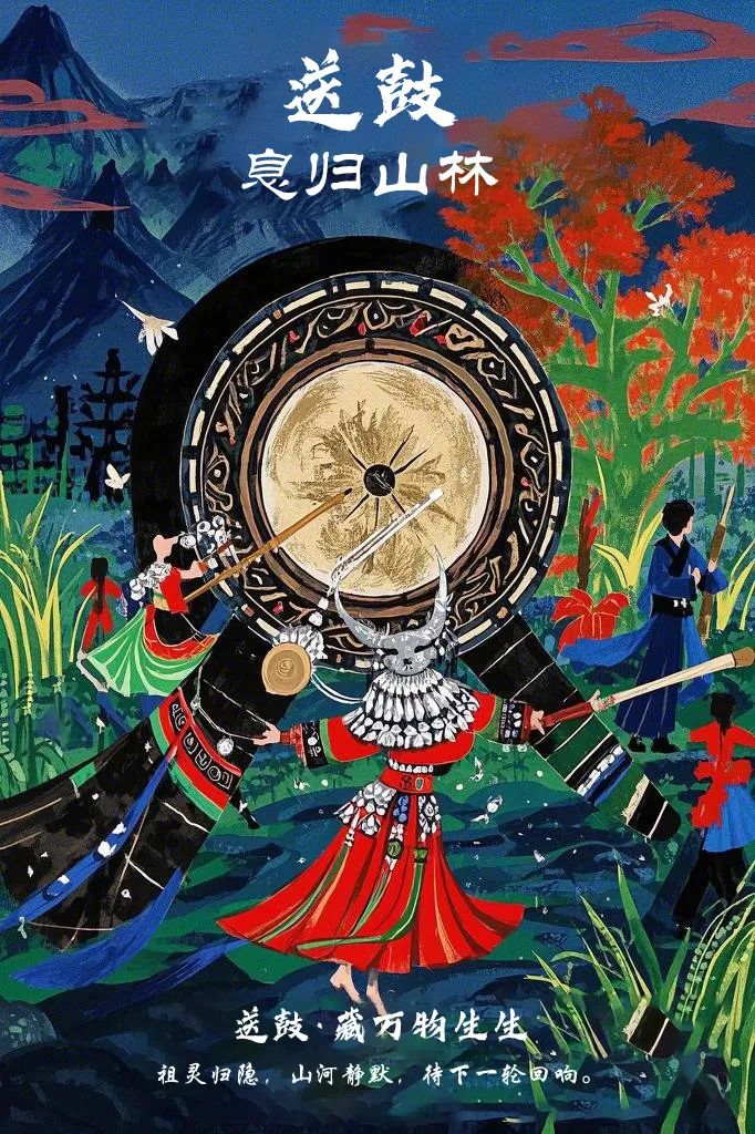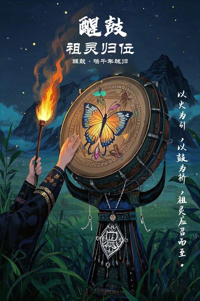 设计说明:围绕“醒鼓、转鼓、送鼓”三大仪式,以“唤醒·共舞·归息”为叙事主线,融合苗族靛蓝、黑红主色调及蝴蝶妈妈、木鼓纹等图腾。醒鼓海报聚焦祭司唤灵,暗夜火光与银饰交织;转鼓以旋涡构图展现芦笙舞狂欢,赤红翠绿象征祭祀与丰收;送鼓描绘晨曦归鼓,灰蓝晨光传递静谧永恒。统一运用蜡染纹饰、书法标题,平衡传统符号与现代视觉,强调族群信仰与自然循环,兼具文化深度与艺术感染力。
