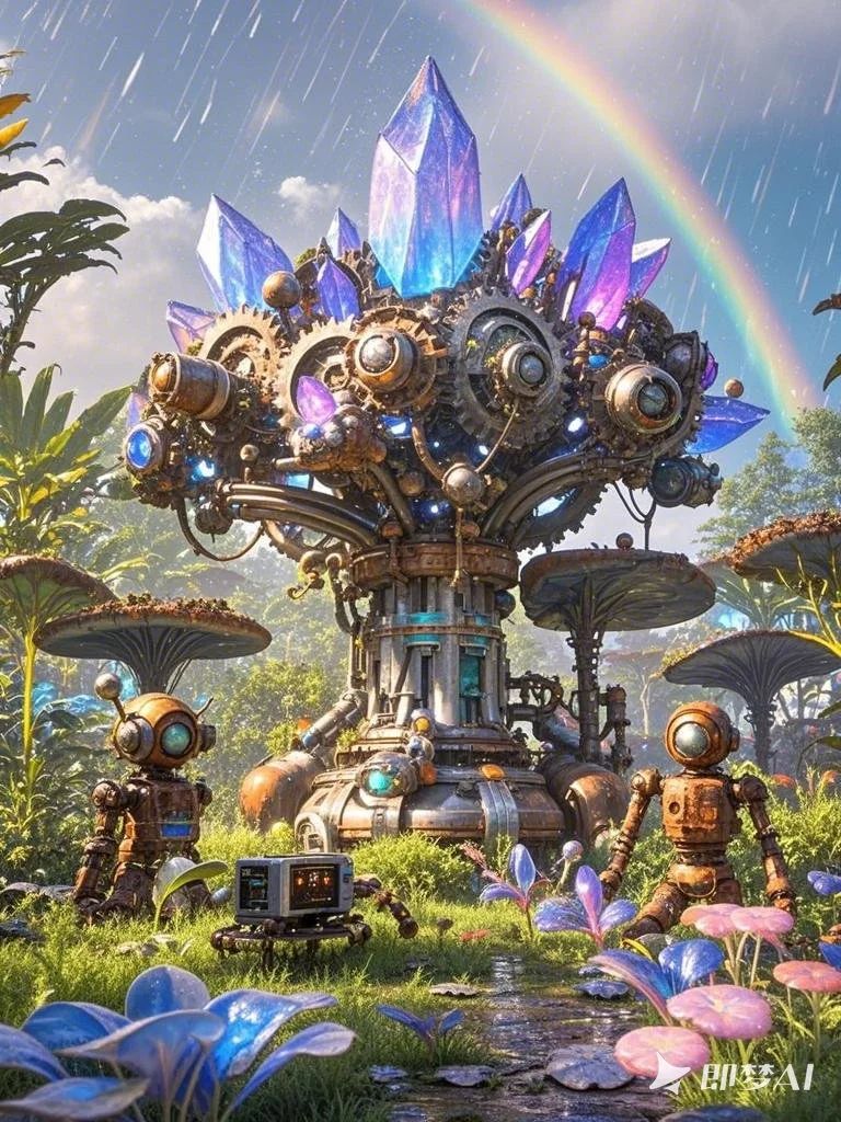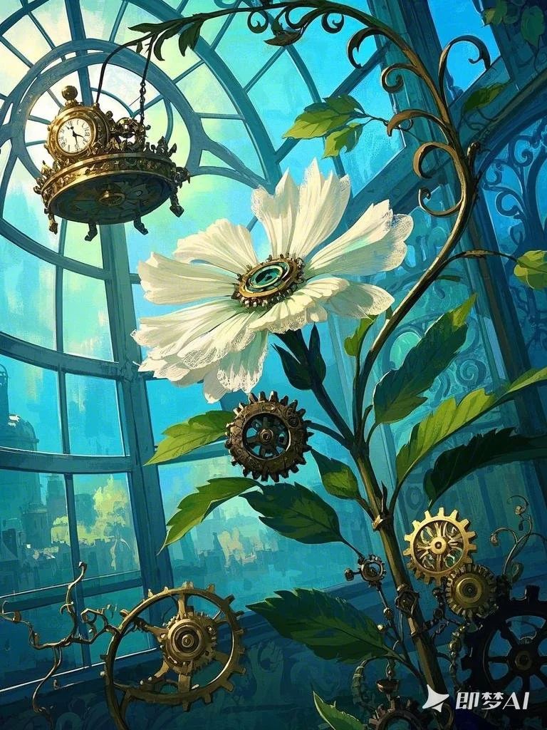 设计说明:本作品由即梦AI精心制作。画面以“玻璃花房”为空间载体,将“机械齿轮”的工业质感、“复古钟表”的时光隐喻,与盛放的“花朵”自然生机结合。齿轮缠绕花茎,钟表悬于穹顶,在通透光影中,实现蒸汽朋克机械美学与自然生命力的碰撞,演绎科技与自然共生的奇幻意境,传递时光流转中生命绽放的浪漫想象。