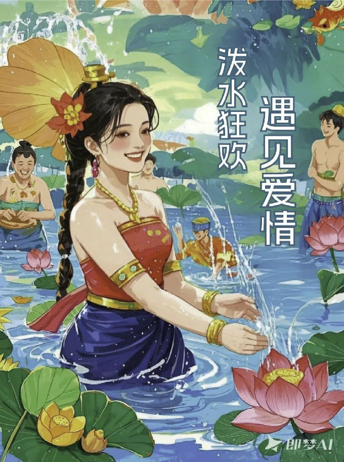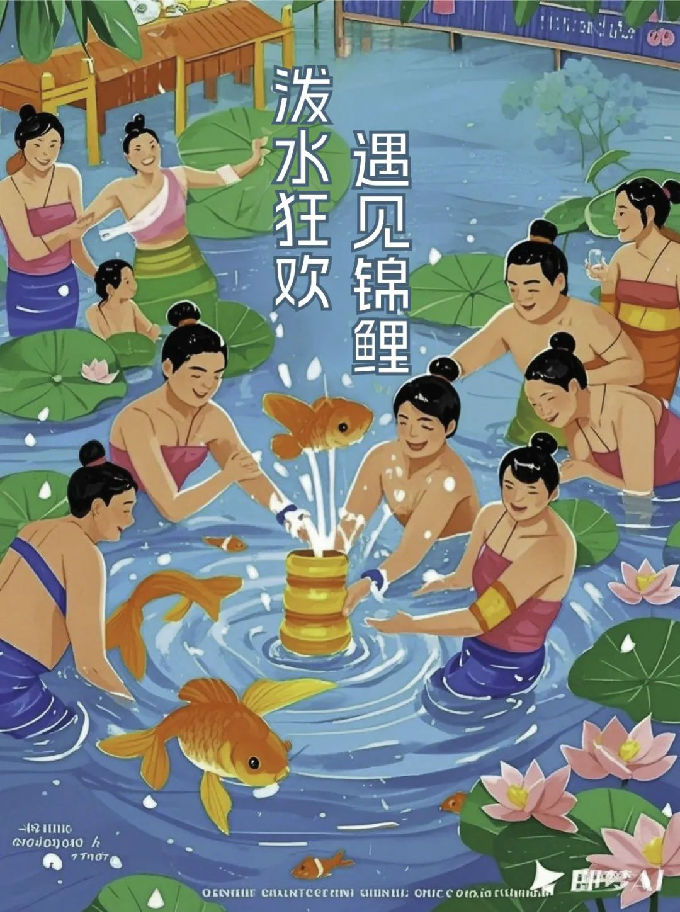 设计说明:人们穿着色彩鲜艳的傣族服饰,互相泼水祝福,脸上洋溢着笑容。画面中加入了一些象征健康财富的元素,突出了泼水节的欢乐氛围、文化内涵以及对健康财富的祝福,一系列海报主题分别是“泼水狂欢,遇见爱情”“泼水狂欢,遇见友谊”“泼水狂欢,遇见锦鲤”,同时也是寄托着美好的愿望与期望。
