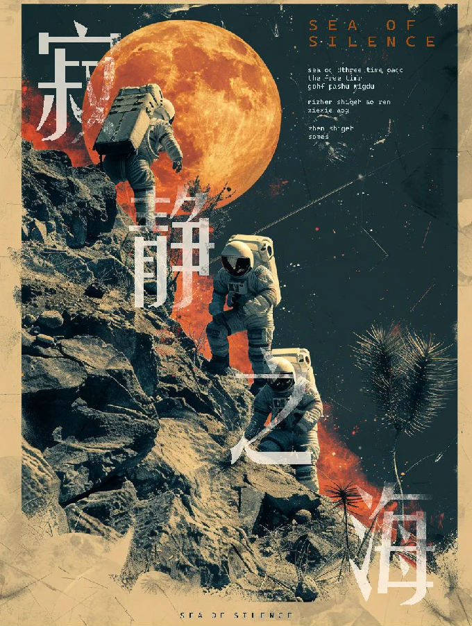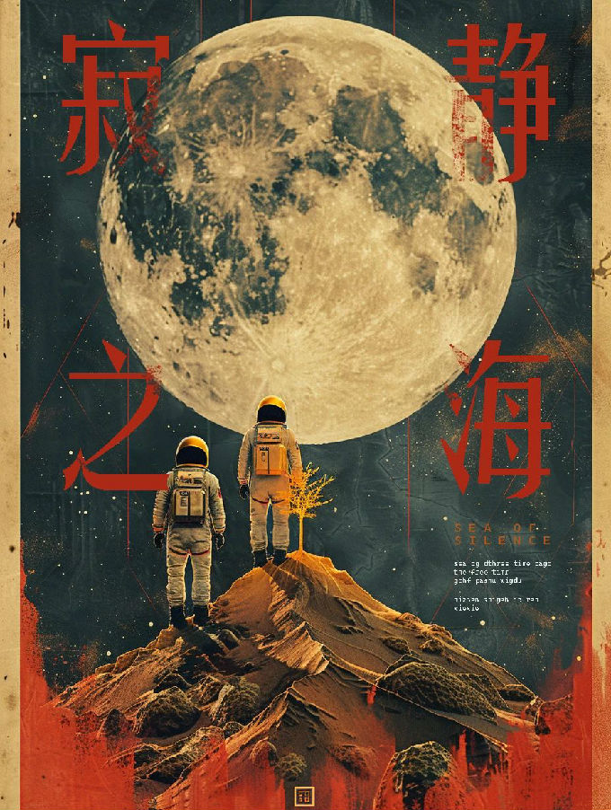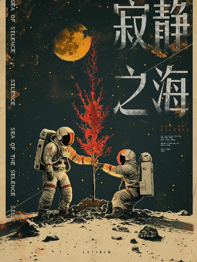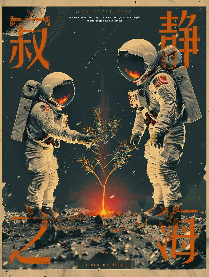 设计说明:本系列海报基于Midjourney生成图像,后期融入PS叠加的纸张纹理与手工划痕,通过色调平衡强化复古胶片质感。装饰性线条与高饱和色块碰撞,以数字创作与手工质感的结合,再现太空黄金时代的科幻美学,致敬人类登月壮举。