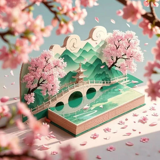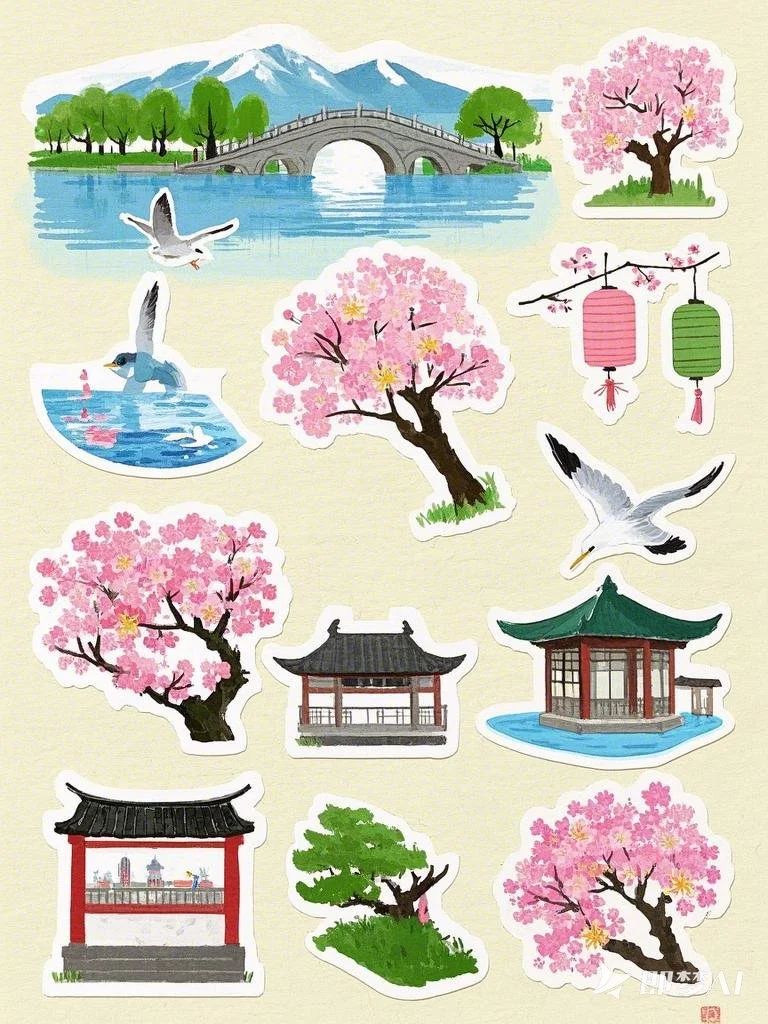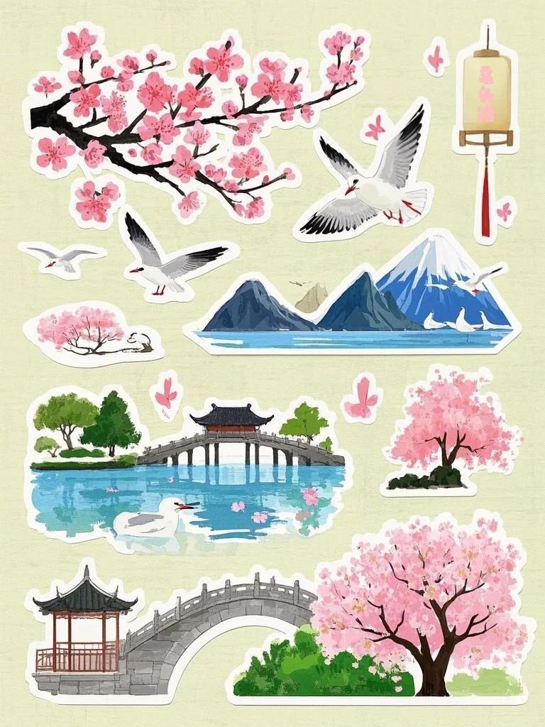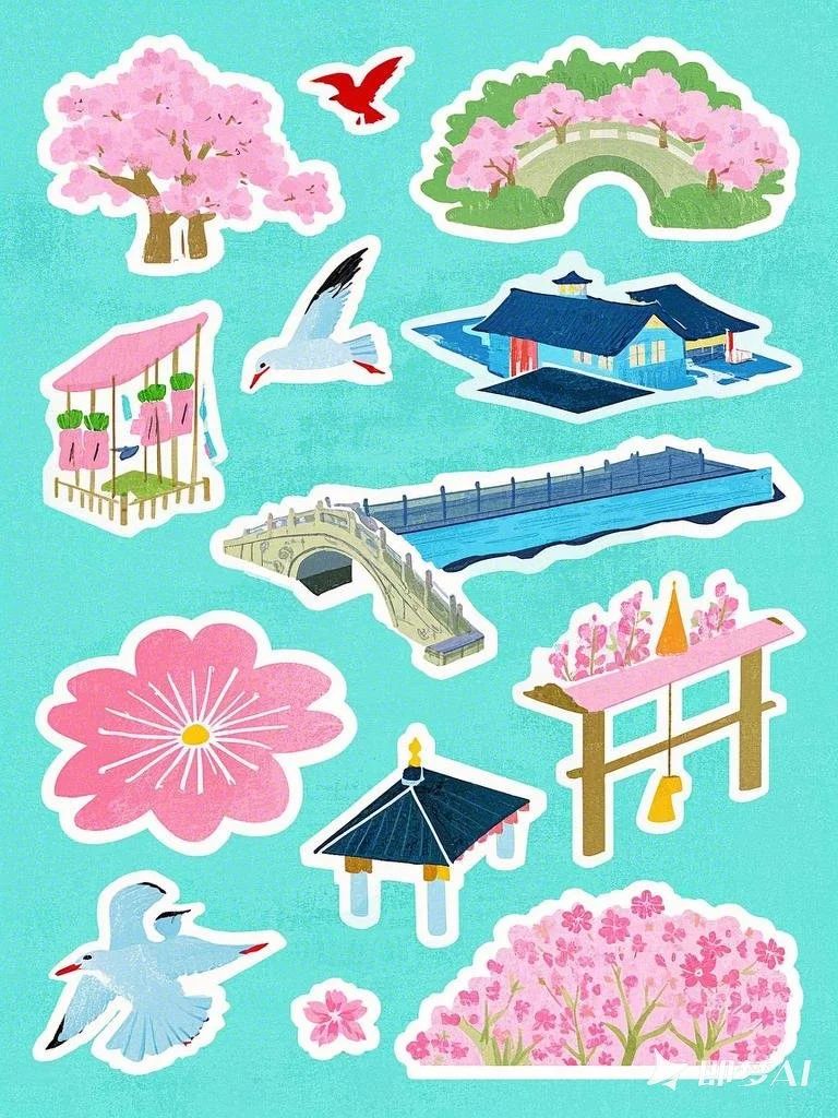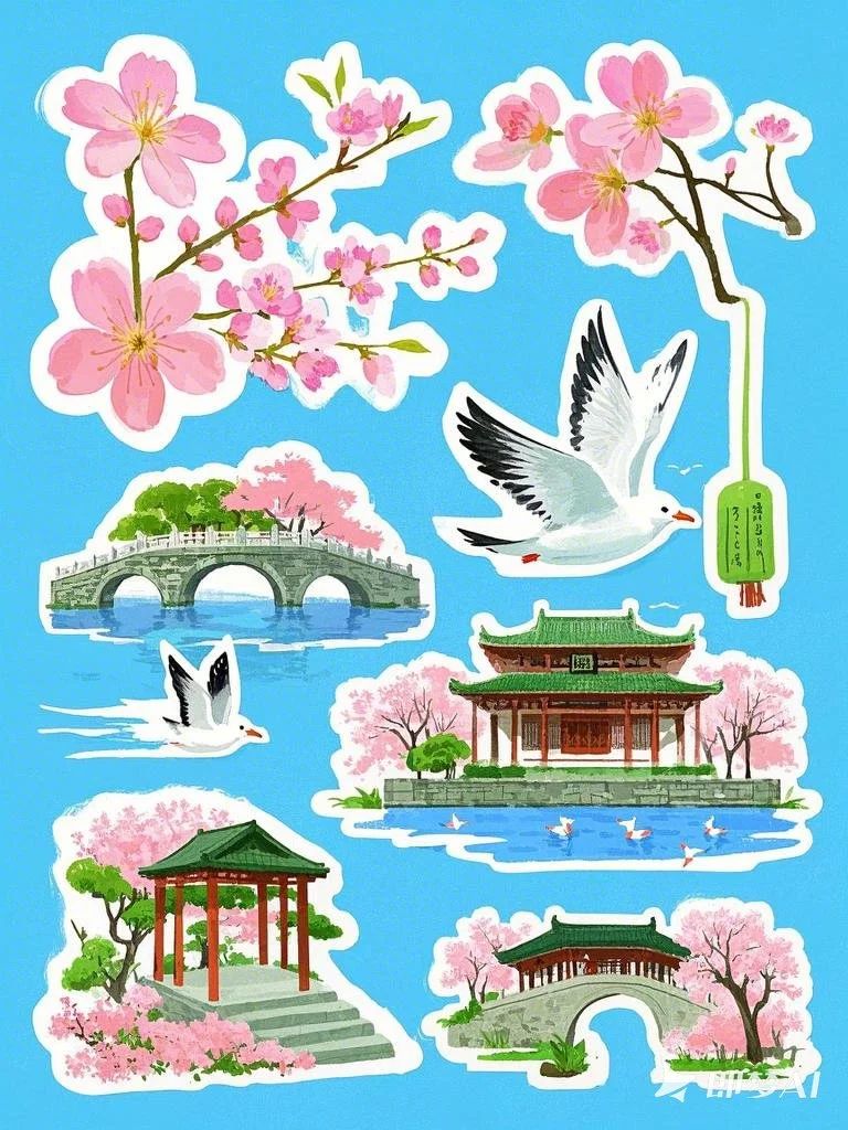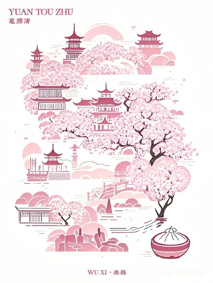设计说明:本文创由即梦AI为主精心制作,以鼋头渚景色为核心主题,尤其是其盛开美丽的樱花,巧妙地融入了诸多鼋头渚其他传统美学元素。通过樱花美景与阁楼、湖景等景色的交相呼应的视觉效果,以及对长春桥、红嘴鸥等元素的细腻描绘,有效增强了鼋头渚的春日氛围,凸显了传统文化的深厚韵味,并展现了自然界的壮丽生机。