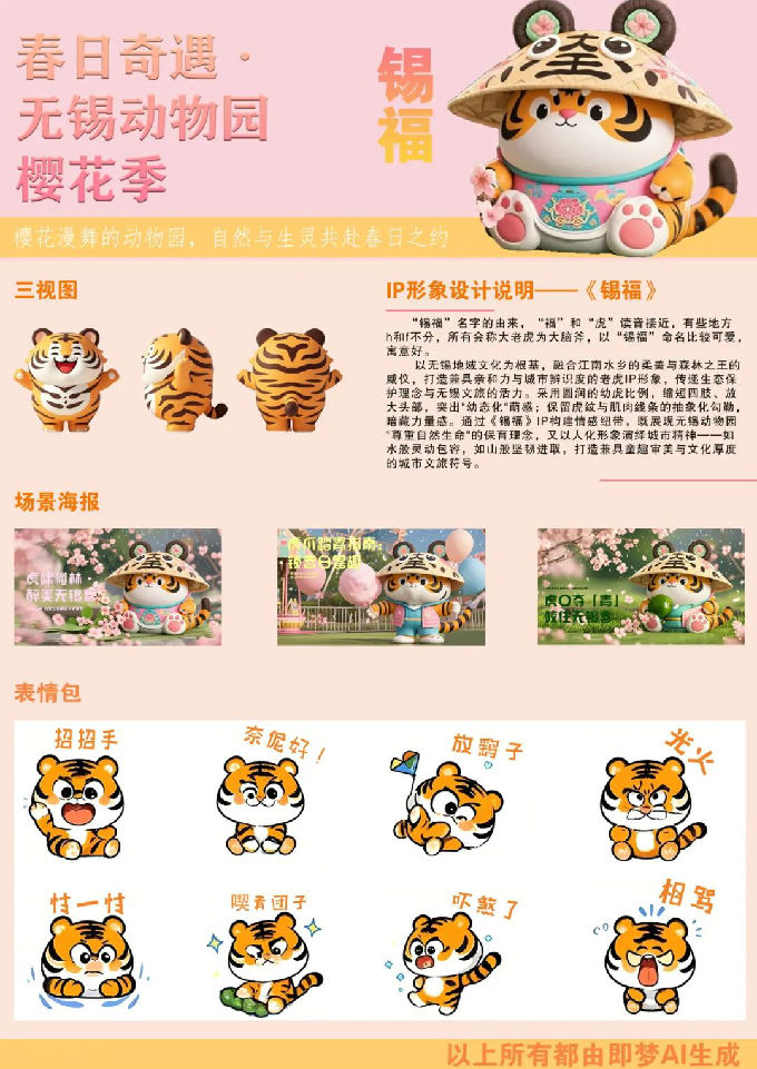 设计说明:IP形象设计说明——《锡福》“锡福”名字的由来,“福”和“虎”读音接近,有些地方h和f不分,所有会称大老虎为大脑斧,以“锡福”命名比较可爱,寓意好。无锡地域文化为根基,融合江南水乡的柔美与森林之王的威仪,打造兼具亲和力与城市辨识度的老虎IP形象,传递生态保护理念与无锡文旅的活力。采用圆润的幼虎比例,缩短四肢、放大头部,突出"幼态化"萌感;保留虎纹与肌肉线条的抽象化勾勒,暗藏力量感。通过《锡福》IP构建情感纽带,既展现无锡动物园"尊重自然生命"的育理念,以人化形象演绎城市精神——如水般灵动包容,如山般坚韧进取,打造兼具童趣审美与文化厚度的城市文旅符号。