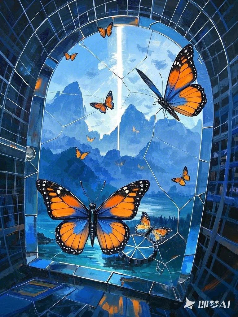 设计说明:本作品由即梦AI精心制作。这幅作品以 “破碎窗格” 为视觉纽带,串联起现实与想象的双重维度。画面中,“蝴蝶”成为自由的符号,于“破碎窗格”间翩跹,既有冲破禁锢的动态感,又赋予画面诗意的灵动感;窗外“山水景致”以蓝调铺陈,展现自然的辽阔与静谧,与窗内破碎结构形成张力。设计通过“破碎窗格”的解构形式,结合“蝴蝶”的意象表达,最终落位于对“自由意境”的诠释 —— 既呈现视觉层面的冲突美学,也隐喻打破既有边界、拥抱自然本真的精神追求。