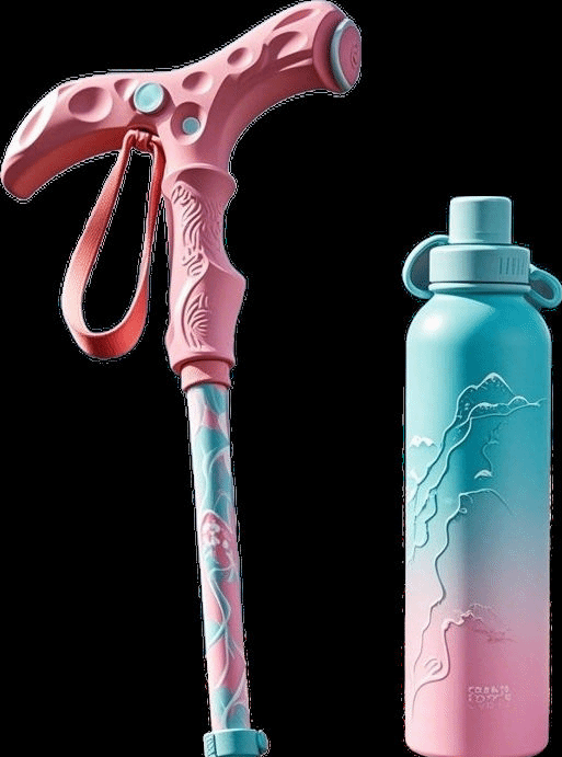 设计说明:为提升游客登山游览体验,同时融入景区文化特色,既满足登山需求,又能成为游客珍藏的文创产品。主色为樱粉色(春)与湖蓝色(四季),呼应景区主题色系。登山杖手柄雕刻(激光雕刻太湖波浪纹)成太湖石造型,杖身印有鼋头渚等高线地图;杖体预留二维码区域,扫码可解锁鼋头渚历史故事或AR虚拟景观。运动水壶采用渐变湖蓝色和粉色,瓶身浮雕樱花纹路。提供刻字服务,游客可铭刻姓名或游览日期,增强纪念意义。