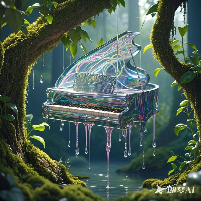 设计说明:画面描绘了一架正在融化的钢琴,如同被阳光晒化的雪糕,琴键化作液体缓缓滴落,却奇迹般地被悬挂在一片森林里。璃树枝折射出钢琴流淌的曲线,仿佛冰晶在捕捉流动的旋律。本设计旨在使工业的坚硬与自然的脆弱进行对话:钢琴的消亡成了另一种诞生,玻璃的冰冷反让消逝的乐曲永恒。观众能同时听见寂静的轰鸣,看见声音的重量,触碰一首融化又重生的诗。