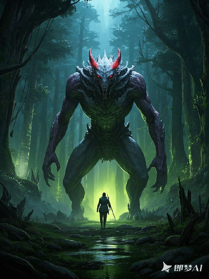 设计说明:本插画由即梦AI精心制作,作品以“奇幻冒险与勇气试炼”为主题,构建出一个神秘而危机四伏的森林场景,展现渺小勇者直面强大魔物的震撼瞬间,传递出勇气与挑战未知的精神内涵。魔物:画面中心的魔物是视觉焦点,造型融合狰狞兽面与健硕身躯,红角红眼搭配暗紫、墨绿的皮肤,散发着邪恶与恐怖气息,象征着未知且强大的威胁。