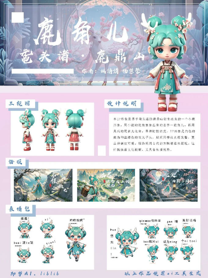 设计说明:“鹿角儿”IP形象灵感源自鼋头渚鹿鼎山,以白色鹿角和蓝绿双丸子头为特色,发髻点缀樱花,俏皮可爱。名字结合“鹿角”与吴语儿化音,活泼亲切。服饰选用齐胸襦裙,既传承传统文化,又具现代传播力,凸显文化根脉与时尚气息。