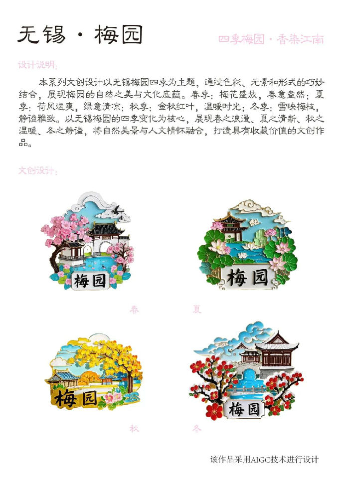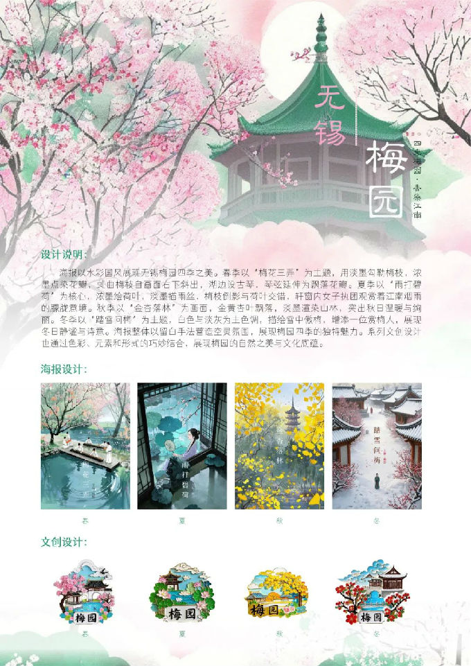 设计说明:本系列文创设计以无锡梅园四季为主题,通过色彩、元素和形式的巧妙结合,展现梅园的自然之美与文化底蕴。春季:梅花盛放,春意盘然;夏季:荷风送爽,绿意清凉:秋季:金秋红叶,温暖时光:冬季:雪映梅枝,静谧雅致。以无锡梅园的四季变化为核心,展现春之浪漫、夏之清新、秋之温暖、冬之静谧,将自然美景与人文情怀融合,打造具有收藏价值的文创作品。