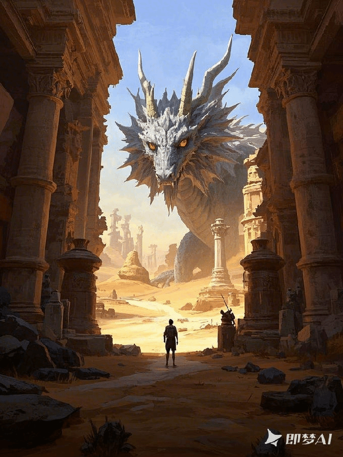设计说明:本插画由即梦AI精心制作,作品围绕“奇幻冒险”主题展开,将古老神秘的遗迹与强大威严的巨龙相结合,营造出充满未知与挑战的氛围,展现人与自然(神话生物)对峙的宏大情境,巨龙是画面核心元素,以其庞大身形和狰狞外表带来强烈视觉冲击。破败的古典柱式建筑和残垣断壁,借鉴古罗马、古希腊建筑风格,暗示着曾经辉煌文明的衰落,增添神秘沧桑感,为巨龙的出现提供奇幻背景,引发对背后故事的遐想。整体采用暖色调为主,如建筑的土黄、沙漠的金黄与天空的淡蓝形成对比,既展现出遗迹的古老厚重,又体现出开阔天空下的未知感。巨龙的灰白色调在暖背景中凸显,使其成为视觉焦点,同时其眼睛的黄色光芒增加画面紧张感。通过近大远小的透视原理,增强画面纵深感和空间感,使巨龙显得更加庞大震撼。光影处理上,模拟自然光照射,遗迹受光部分明亮,阴影部分深邃,营造出真实立体的场景,突出画面的奇幻与戏剧性。