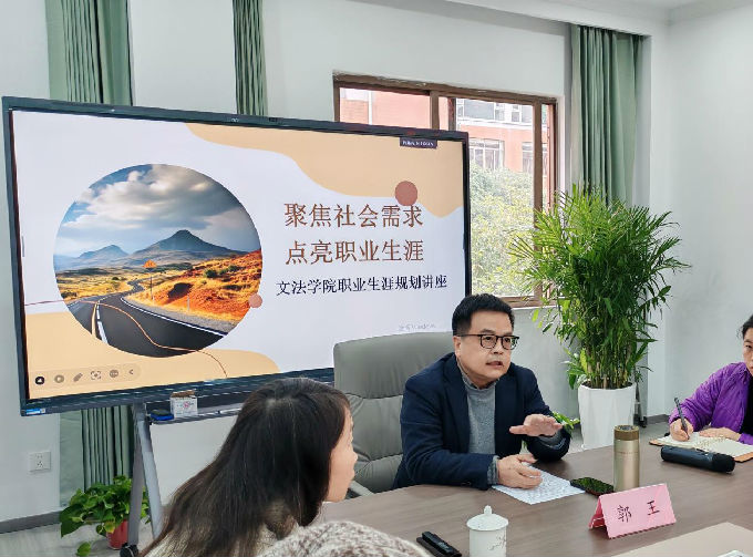 12月12日下午,文法学院汉语言文学专业在学院211会议室顺利举行“聚焦社会需求,点亮职业生涯”规划指导讲座。本次讲座邀请校监事长、无锡市电影电视艺术家协会主席郭王为主讲嘉宾。文法学院肖辉院长主持,副院长刘荔,学校党委委员、副院长吴旻昊,党总支副书记俞昊波出席,文法学院汉语言文学专业师生共同参与了此次活动。