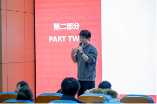 随后,企业代表江苏蜂群文化传媒公司陈子文总经理登台分享,向同学们讲述了他如何在大学时期运用创新思维在电商平台掘取人生第一桶金的故事。他的分享让在场的同学们深受启发,对直播电商行业充满了无限憧憬和期待。