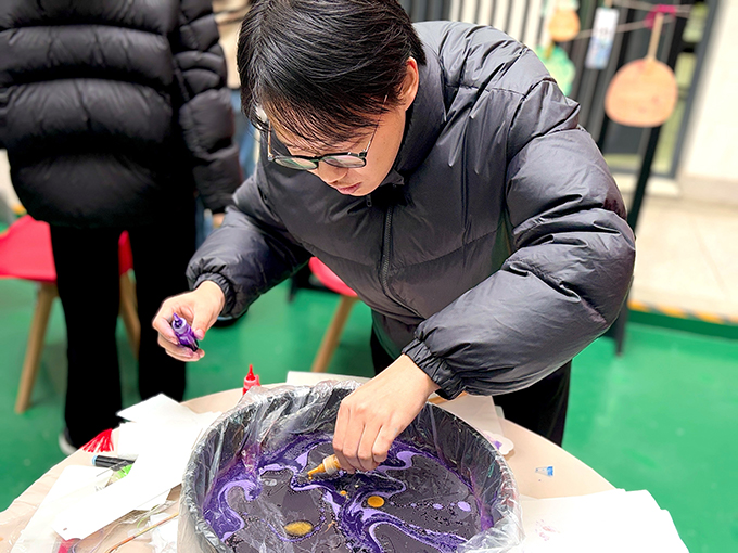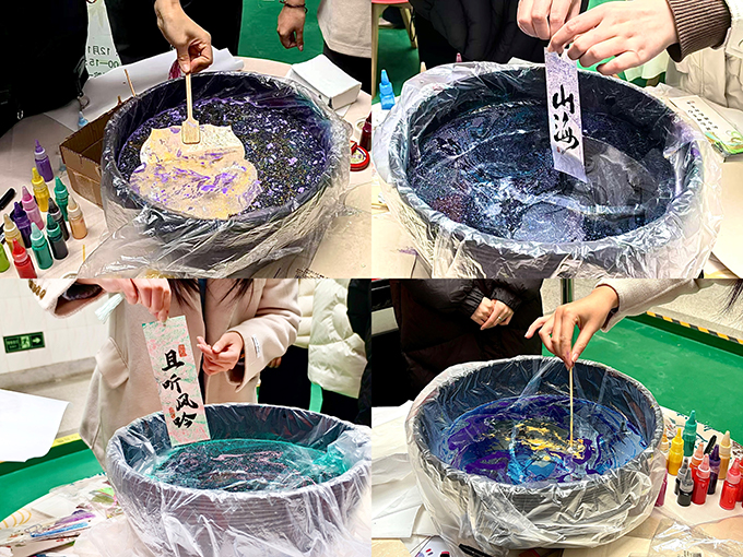 随后,老师们精心挑选扇面和漆料,充分发挥自己的想象力和创造力,用手中的工具和材料描绘着心中的古韵新风。他们将自己喜好的漆料小心翼翼地滴入水中,滴滴漆液在水面轻舞,接着轻轻搅拌水面将漆液拨开,再将洁白的扇面缓缓沉入水中,摇动、旋转、轻推扇柄,任由水波引导漆彩自由流淌,白色的扇面最终定格成一幅幅独一无二、形态各异、富有诗意的扇中画卷。