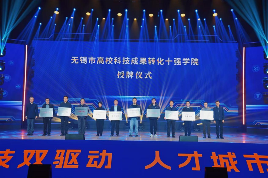 活动现场举行了无锡市高校科技成果转化十强学院授牌仪式,无锡市教育局高等教育处处长高群、市科技创新服务中心主任肖凤为入选的十所二级学院代表授牌,以表彰其在科技成果转化方面的突出表现,激励更多高校积极推动科技创新与产业应用紧密结合。