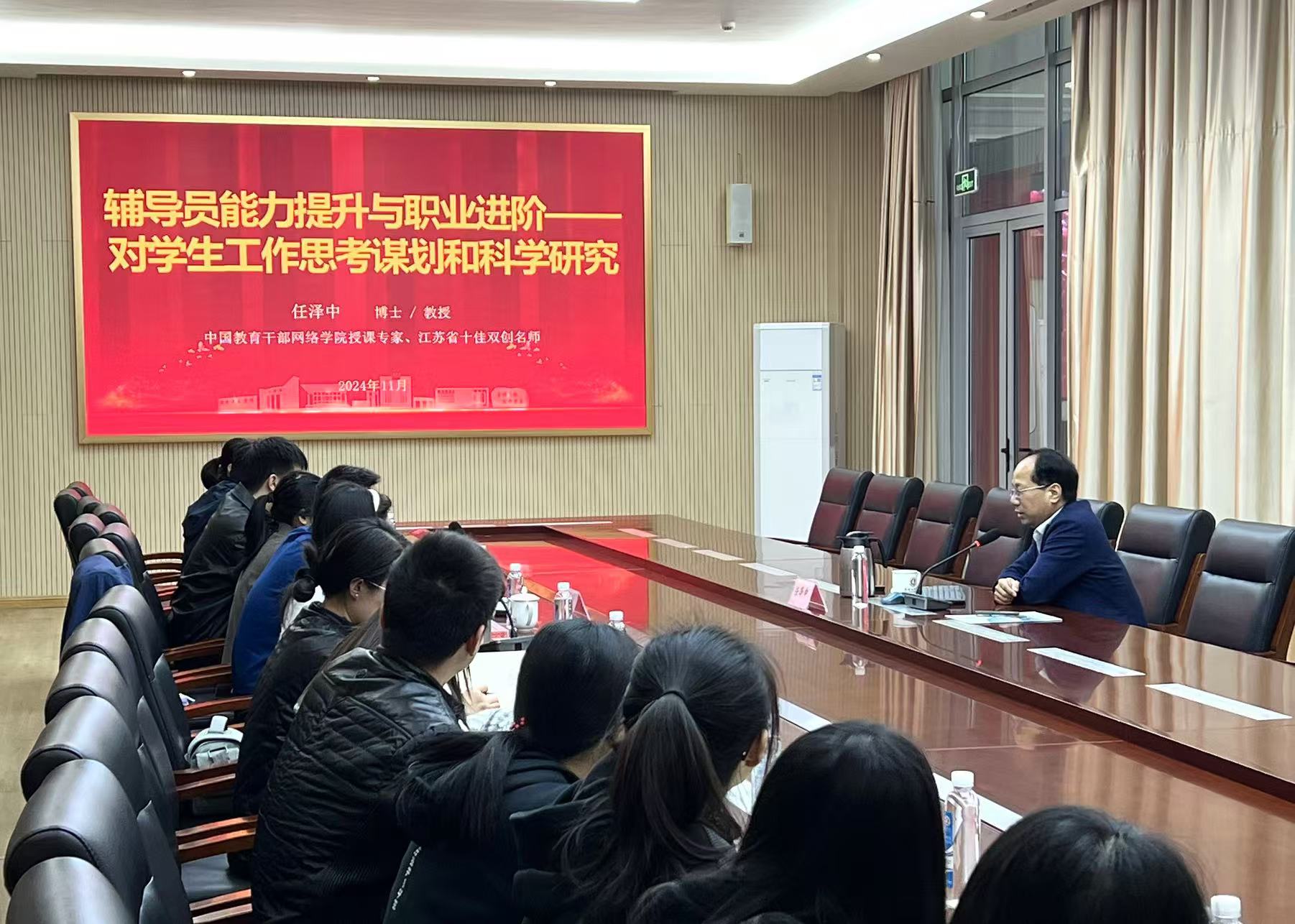 本次课程荣幸邀请到了江苏大学党委学生工作部(处)部(处)长任泽中教授作为授课嘉宾,物联网工程学院党总支副书记、学工秘书及全体辅导员共同参与学习。任处长是中国教育干部网络学院授课专家、江苏省十佳双创名师,首批“江苏省大学生就业创业导师”,理论研究著作丰硕,曾位列“全国创业教育核心论文专家榜”第6位,主持厅级以上教育管理类课题20余项,发表相关论文40于篇,出版有关著作5部。