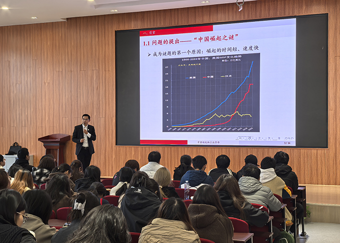 为深入总结历史经验与教训、培养学生们的工业文化与精神传承意识,应用经济学博士刘尧成教授围绕“中国崛起的表现与质疑”、“西方工业革命的历史”以及“中国的工业革命之路”三大方面为同学们展开详解。刘教授强调了“新质生产力”对中国工业革命的重要影响,从技术革命所催生的历次工业革命对于不同民族国家兴衰的效应来看,在世界历史进程之中对于人类文明发展有着伟大贡献的中华民族,目下正处在以人工智能为代表的技术革命所催生的新的工业革命时刻,大学生应该把握住以人工智能为代表的先进技术,在新时代的浪潮中深耕专业学习,提高自身专业水平,为实现中华民族伟大复兴贡献自己的青春力量。