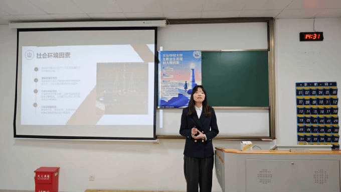 首先,同学们以抽签抉择登台次序,公平开启演讲之序。在比赛过程中,同学们通过PPT展示的形式,深入剖析自身职业规划。从全面的mbti分析,清晰阐述自身优势与劣势,到细致的家庭与社会环境分析,充分考量外界因素对职业选择的影响。参赛者们以合理的逻辑和清晰的表达,展现出当代大学生对职业规划的严谨态度和创新思维,不仅让评委老师们深入了解其职业理想与规划路径,也为台下观众带来了宝贵的借鉴与启示。同学们的规划设计内容整体结构完整、逻辑清晰、条理清楚、详略得当,突出了同学们对未来发展的重点,也充分展示了同学们扎实的专业基础和较强的综合能力。