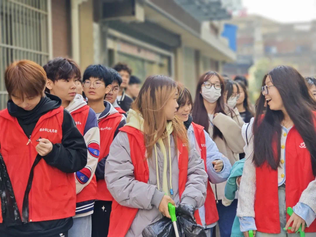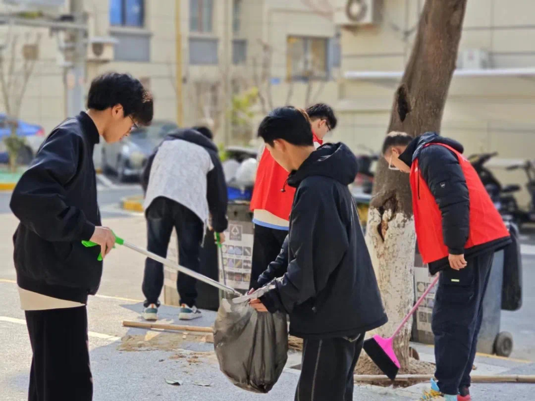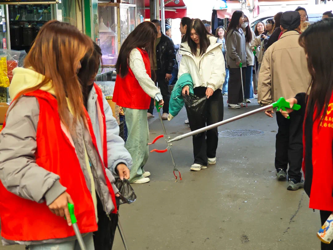 活动中期,大家步入了这片温馨又充满烟火气息的小街:手撑垃圾袋、身体微弯着、眼神锐利地捕捉着道路上的大小垃圾,同学们积极行动、干劲十足。不一会儿,一个个垃圾袋便被填满了,与其一同填满的还有大家的满足感和光荣感,油然而生。期间虽有些微辛苦,但两组同学们都乐在服务中,收获颇多。不久后街道焕然一新,放眼看去,灿阳之下,红色马甲越发地鲜红可爱。