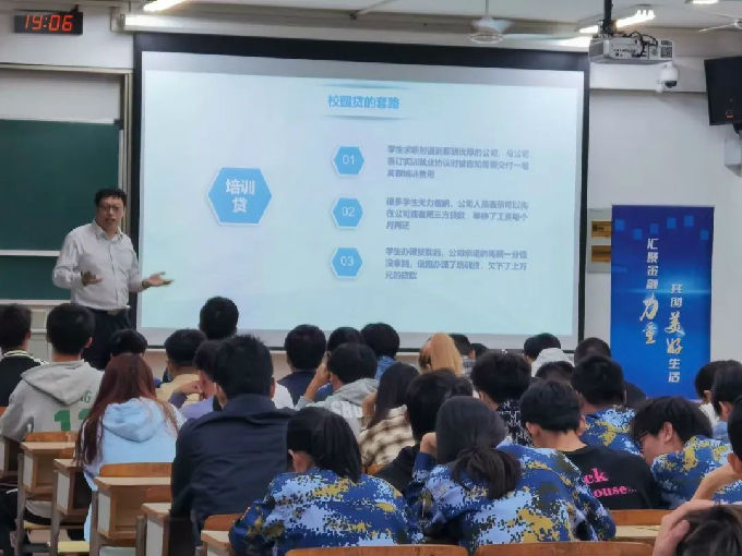 讲座开始,曾主任用一段视频展示一些大学生借校园贷遭到诈骗的典型案例由此引入本次活动,他结合这些案例分析了当代大学生想去借贷的原因。紧接着曾主任向大家介绍了什么是校园贷以及它的危害,并为大家讲解了银行正规贷款的利息,催收,担保的方式。曾主任重点为大家介绍了四种常见非法机构组织的贷款套路和手段。一是培训贷,学生求职时遇到薪酬优厚的公司,与公司签订实习就业协议时被告知需要支付一笔高额培训费收到钱后就会销声匿迹;二是刷单贷,不法分子自称网贷平台职工“刷单冲业绩”并支付小额佣金作为报酬,诱惑在校学生用自己的身份信息申请网络贷款,后期骗子放款卷钱跑路,尚未偿还的款项仍需由申请贷款的学生自己偿还;三是美容贷,主要瞄准爱美却又缺钱的学生,当学生无力支付手术费用时美容师会怂恿学生贷款。四是连环贷,诈骗分子会抓住学生想要急需解决当下问题的心理,推荐同学在不同贷款平台贷款,从此循环往复,使得借款人的债务越积越高,而且无法偿还。同时,曾主任还阐述了非法集资的定义,其常见手法有承诺高额回报,编造虚假项目,以虚假宣传造势,还有利用亲情诱骗。