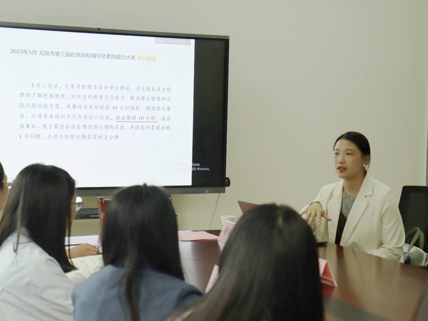 接着由胡晓丹老师发言,她围绕辅导员的职业发展路径和技能要求进行了深入研讨。她分享了自己的工作经验和心得,提出了一系列实用的指导意见,比如不要用套路去回答案例分析的题、要有自己的特点、要思考全面、随机应变等。同时,胡老师也介绍了一些成功案例和创新做法,为其他辅导员提供了宝贵的借鉴和启示。