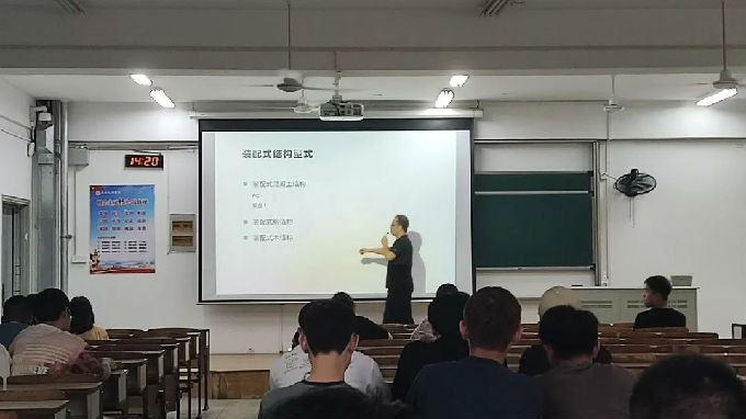 讲座伊始,唐欣先生简单地做了自我介绍,并表示非常高兴能与大家分享关于装配式结构的知识和经验,紧接着直入主题介绍了装配式结构的不同形式。其中包括装配式混凝土结构、装配式钢结构、装配式木结构。随后唐欣先生向同学们展示了有关装配式建筑的一些政策规定,这些政策的制定对推进装配式建筑的应用起到积极的促进作用。讲座中还为大家讲解了装配式钢混组合结构的优点及其应用,让学生充分了解了装配式建筑如今广泛应用的原因。之后唐欣先生向同学们介绍了装配式结构选型的思路,并展示结构优化案例进行了分析。