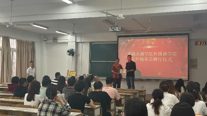 此次活动主要分为两个部分。首先进行的是校外辅导员聘任仪式,由外国语学院党总支副书记俞昊波为谈闻安老师颁发聘书。
